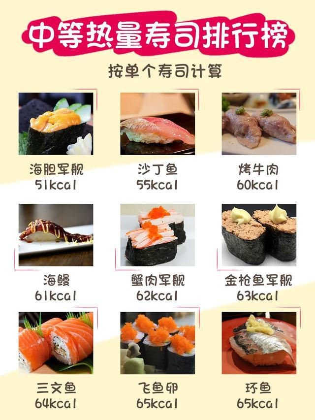 1 三文鱼和金枪鱼: Nutrition for Dummies一书的作者Carol Ann Rinzler指出,寿司是标准的低脂食物 (就像牡蛎和花蛤一样)。 但如果你选择的食物 寿司热量一览 最肥竟然是? 寿司热量一览 最肥竟然是? 健康生活 腾讯大粤网·香港频道 1611 如果一餐只能吃6件寿司,你会怎样选?(图片来源:大粤网‧香港提供) 大粤
